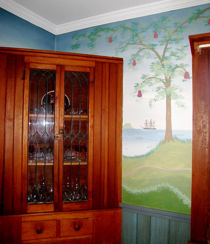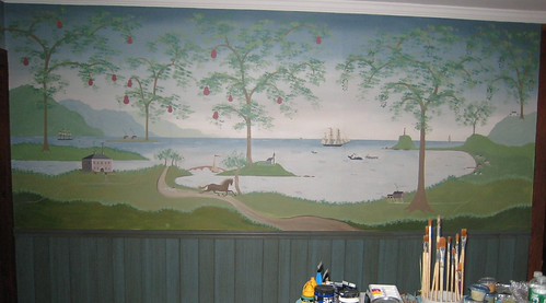 If you scroll down this page, you can see more of the mural I painted for the movie set. Further down the page, I also show the process I used to paint it. I painted it in the living room of a big house in Dennis in Cape Cod, Massachusetts in March of 2007. The movie’s talented director, Gwendolyn Wynne, asked me to paint it not only as a background for many of the scenes shot in the house, but also as a namesake of the movie since the mural was painted in the American Primitive style of painting made famous by the Puritans and the Pilgrims in Massachusetts. Gwen co-wrote the screenplay which is the story of two teenage sisters growing up in the 70’s in Dennis, Cape Cod who discover a secret about their father. The way the girls deal with the secret unfolds into a comical yet moving story wonderfully and artfully depicted by the director.