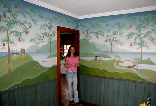 Here I am teaching Gregory and Chloe how to do stencils on the wall. We hand cut a pineapple stencil, which is a sign of hospitality in American Primitive art, and we painted it with a sponge around one of the rooms. The kids thought it was really fun and loved seeing their art in the movie!